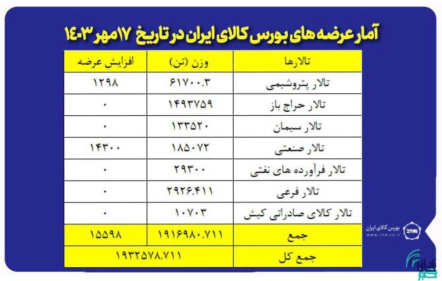۹۲ هزار و ۲۹۸ هزار تن مواد پلیمری و شیمیایی در تالار پتروشیمی و فرآورههای نفتی عرضه میشود.