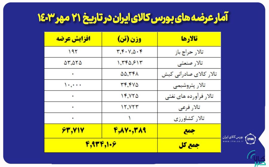 تالار حراج باز میزبان عرضه ۲ میلیون و ۶۲۵ هزار تن سنگآهن دانهبندی، ۶۲۴ هزار تن کنسانتره سنگآهن، ۱۵۰ هزار تن سنگآهن کلوخه، ۷ هزار تن وکیوم باتوم، یک هزار و ۴۰۸ تن پلیوینیلکلراید و ۲۸۸ تن متیلن دی فنیل دی ایزوسیانات است.