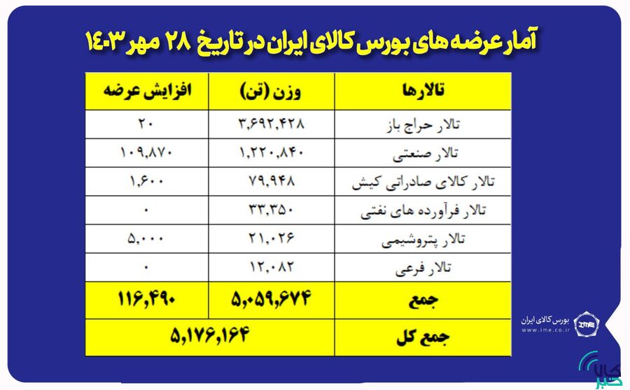 تالارهای بورس کالای ایران در نخستین روز هفته (شنبه ۲۸ مهر ماه) میزبان عرضه ۵ میلیون و ۱۷۶ هزار و ۱۶۴ تن انواع کالا و محصول هستند.