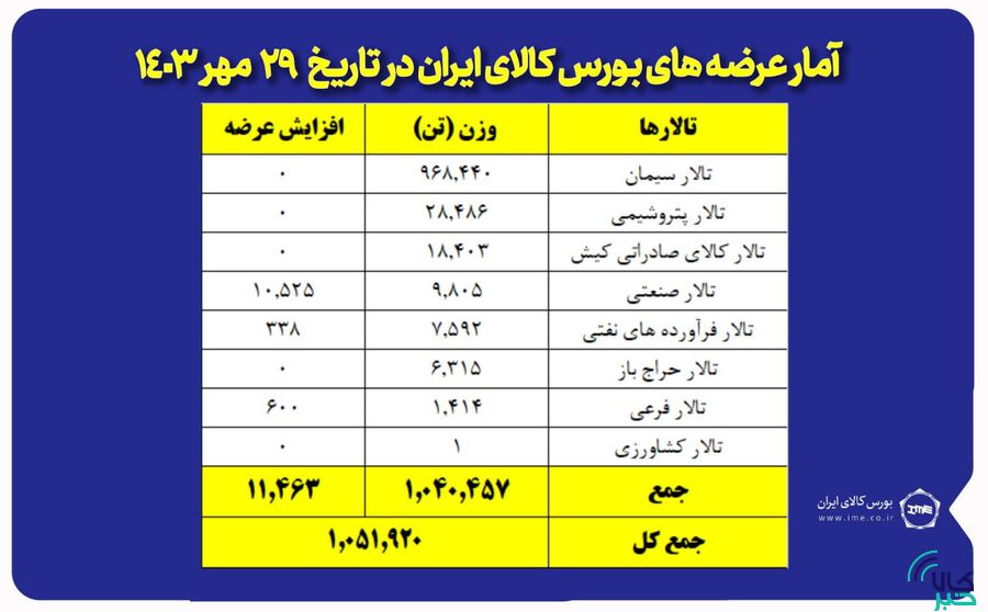 به گزارش کالاخبر، در تالار محصولات صنعتی و معدنی ۵ هزار تن هیدروکسید آلومینیوم، ۵ هزار تن مس کم عیار، ۵ هزار و ۲۰ تن شمش آلومینیوم، ۲ هزار تن اکسید آلومینیوم، یک هزار و ۹۰۰ تن کک متالوژی و یک هزار و ۴۰۵ تن شمش روی عرضه می شود.