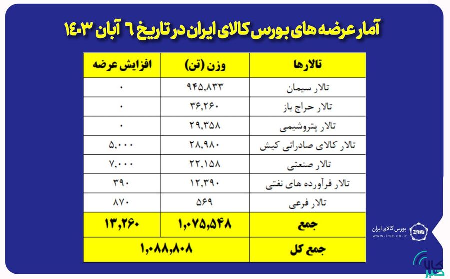 تالار فرآوردههای نفتی و پتروشیمی هم شاهد عرضه ۴۲ هزار و ۱۳۸ تن مواد پلیمری و شیمیایی است.