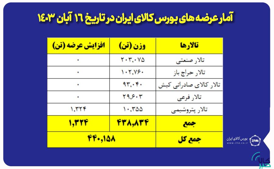 تالار صادراتی نیز شاهد عرضه ۴۳ هزار و ۴۰ تن قیر و ۵۰ هزار تن کنسانتره سنگ آهن است.