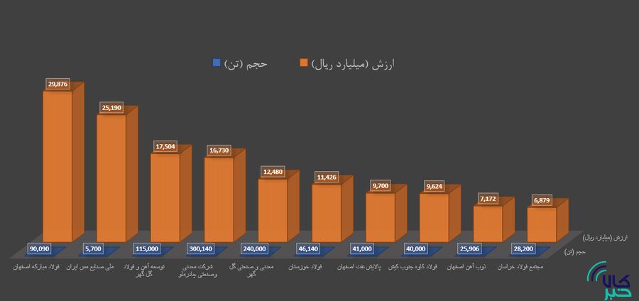 ذوب آهن اصفهان با معامله ۲۵ هزار و ۹۰۶ تن آرگون، تیرآهن،شمش بلوم و میلگرد به ارزش ۷۱۷ میلیارد تومان نهم شد و مجتمع فولاد خراسان نیز با فروش ۲۸ هزار و ۲۰۰ تن شمش بلوم و میلگرد به ارزش ۶۸۷ میلیارد تومان رتبه دهم را به خود اختصاص داد.