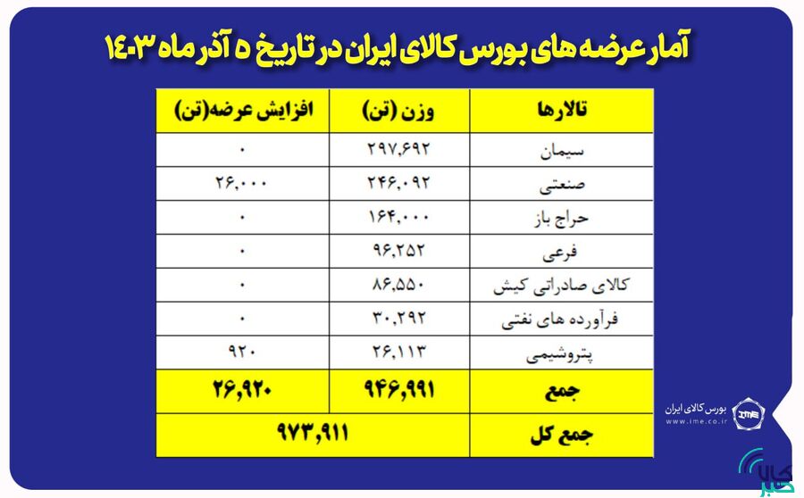 تالارهای بورس کالای ایران در روز دوشنبه ۵ آذر ماه میزبان عرضه ۹۷۳ هزار و ۹۱۱ تن انواع کالا و محصول است.