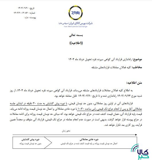 قراردادهای آتی در اولین روز معاملاتی، بدون حد نوسان قیمتی، با دوره پیش گشایش به مدت ٣٠ دقیقه در ابتدای جلسه معاملاتی آغاز و پس از انجام حراج تک قیمتی راس ساعت ١٠:٣٠ با دوره عادی معاملاتی و اعمال حد نوسان قیمت روزانه ادامه می یابد.