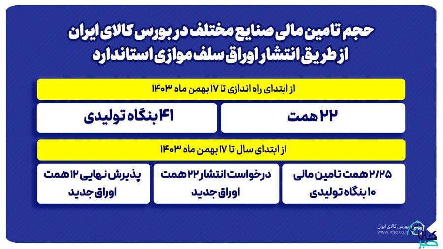 طبق گفته سونیا یاسی رئیس اداره اوراق تامین مالی بورس کالای ایران، از ابتدای سال ۱۴۰۳ تاکنون بیش از ۴۴ درخواست انتشار اوراق، برای تامین مالی بنگاههای تولیدی متوسط و بزرگ در سطح کشور مطرح شده که رقم آن بالغ بر ۲۲ همت است و برآورد میشود این مقدار تا انتهای سال جاری افزایش یابد. براساس آمار اعلامی، از این تعداد ۲۵ شرکت از بخش صنعت و معدن، ۱۳ شرکت بخش پتروشیمی و ۶ شرکت بخش کشاورزی بودهاند که حدود ۱۲ همت از آنها پذیرش نهایی را دریافت کرده و مابقی اوراق نیز تا پایان سال جاری پذیرش خواهند شد. همچنین، از ابتدای سال تاکنون بالغ بر ۲ همت از کل اوراق پذیرش شده منتشر شده است که پیشبینی میشود تا پایان سال جاری این مبلغ به حدود ۱۰ همت افزایش یابد.