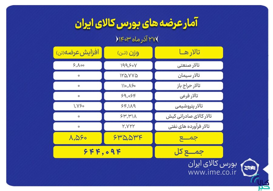 تالارهای بورس کالای ایران در روز سه‌شنبه ۲۷ آذرماه میزبان عرضه ۶۴۴ هزار و ۹۴ تن انواع کالا و محصول است.