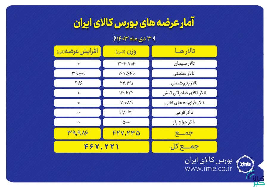امروز همچنین در تالار پتروشیمی و فرآوردههای نفتی ۳۰ هزار و ۳۶۲ تن مواد پلیمری، مواد شیمیایی، قیر و روغن پایه عرضه می شود.