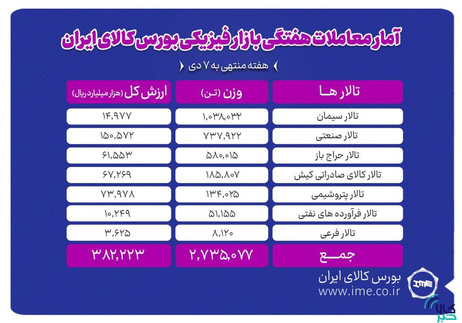 در این تالار یک میلیون و ۳۸ هزار و ۳۲ تن سیمان، ۸۳۸ هزار تن سنگآهن، ۳۴۹ هزار و ۵۴۷ تن فولاد، ۵۳ هزار تن آهن اسفنجی، ۱۴ هزار و ۴۷۵ تن آلومینیوم، ۸ هزار و ۳۲۰ تن مس، ۵ هزار تن چدن و ۳۶ تن کنسانتره فلزات گرانبها معامله شد.