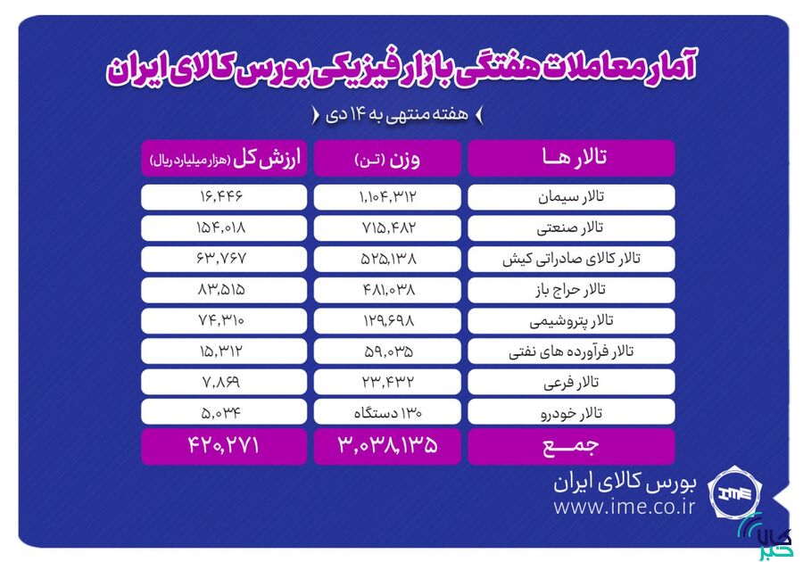 در معاملات هفته گذشته بازار فیزیکی بورس کالای ایران ۳ میلیون و ۳۸ هزار و ۱۳۵ تن انواع محصول به ارزش ۴۲ هزار میلیارد تومان دادوستد شد که نسبت به هفته ما قبل به ترتیب رشد ۱۱ و ۹ درصدی را در حجم و ارزش معاملات تجربه کرد.