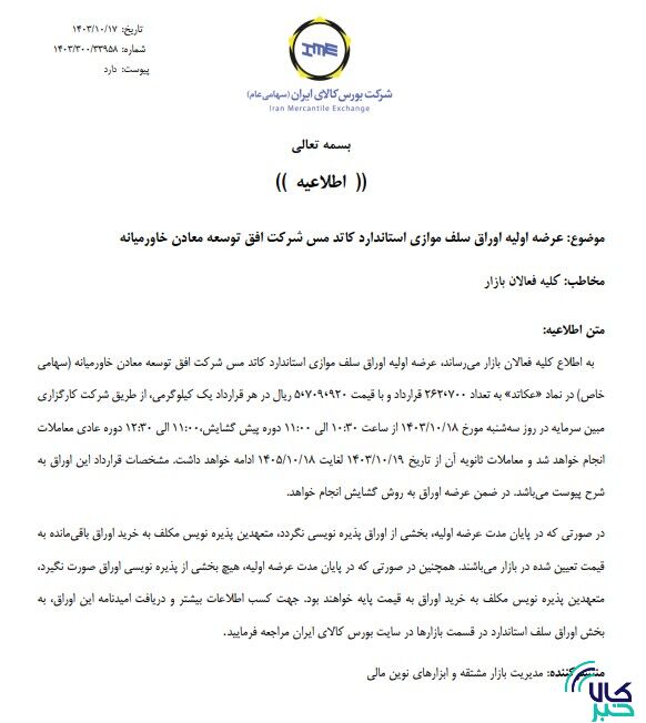 به گزارش کالاخبر،در این اطلاعیه آمده است:عرضه اولیه اوراق سلف موازی استاندارد کاتد مس شرکت افق توسعه معادن خاورمیانه(سهامی خاص) در نماد «عکاتد» به تعداد ۲۶۲ هزار و ۷۰۰ قرارداد و با قیمت ۵ میلیون و ۷۰۹ هزار و ۹۲۰ ریال در هر قرارداد یک کیلوگرمی از فردا انجام می شود.