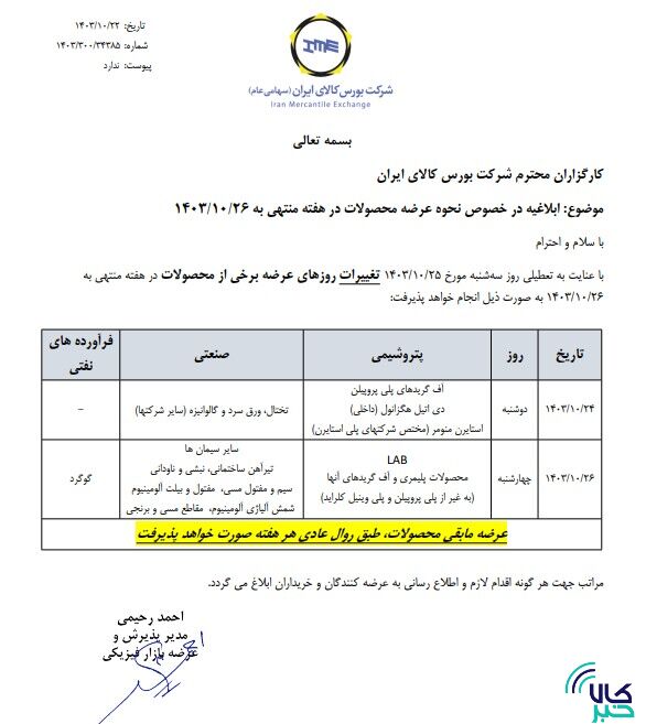 دوشنبه ۲۴ دی ماه:آف گریدهای پلی پروپیلن، دی اتیل هگزانول(داخلی) و استایرن منومر(مختص شرکتهای پلی استایرن) در تالار پتروشیمی و تختال، ورق سرد و گالوانیزه(سایر شرکتها)در تالار صنعتی