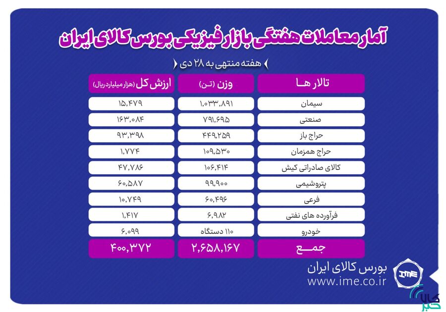 همچنین هفته گذشته یک میلیون و ۳۳ هزار و ۸۹۱ تن سیمان به ارزش هزار و۵۰۰ میلیارد تومان از بستر بورس کالا فروش رفت.