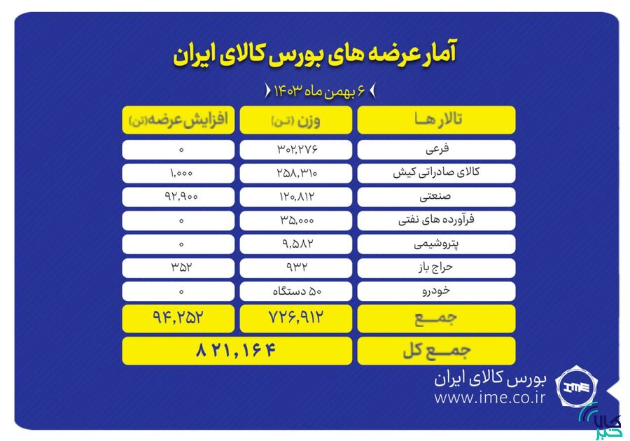 امروز همچنین ۴۴ هزار و ۵۸۲ تن مواد پلیمری، شیمیایی و لوب کات سنگین در تالار پتروشیمی و فرآوردههای نفتی روی تابلو میرود.