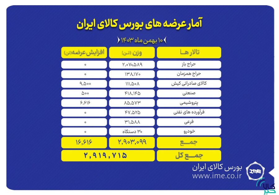 در تالار حراج باز هم یک میلیون ۵۰۵ هزار تن سنگ آهن دانه بندی، ۵۲۰ هزار تن سنگ آهن کلوخه، ۴۰ هزار تن کنسانتره سنگآهن، ۲ هزار و ۳۰۰ تن الکیل بنزن خطی، ۹۸۴ تن استایرن منومر، ۸۰۳ تن منومر وینیل استات، ۵۹۸ تن دی اتیل هگزانول، ۴۰۰ تن تولوئن دی ایزو سیانات، ۳۶۰ تن ارتوزایلن و ۱۴۴ تن متیلن دی فنیل دی ایزوسیانات خالص عرضه شود.