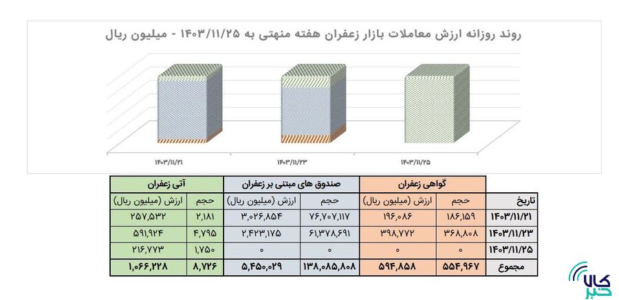 علاوه بر این، در هفته گذشته ۱۳۸ میلیون و ۸۵ هزار واحد صندوق مبتنی بر زعفران معامله شد. در بازار آتی زعفران هم ۸ هزار و ۷۲۶ قرارداد معادل ۸۷۳ کیلوگرم زعفران نگین مورد معامله قرار گرفت. در هفته گذشته ارزش معاملات قراردادهای آتی زعفران نگین تقریبا ۲ برابر ارزش گواهی زعفران نگین بود.