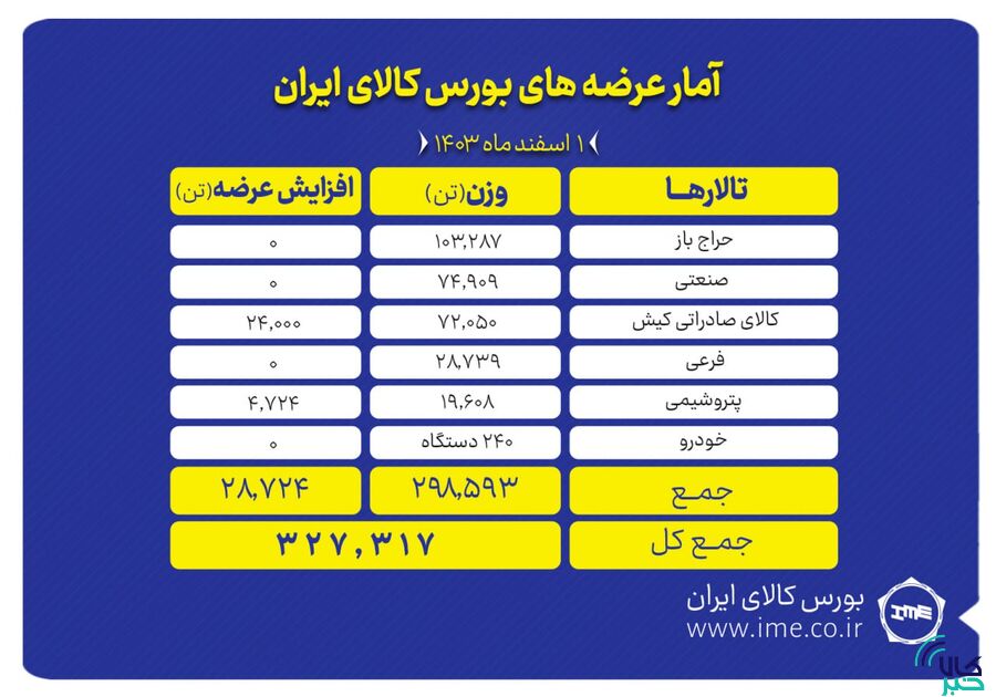 تالارهای بورس کالای ایران (چهارشنبه ۱ اسفند ماه) میزبان عرضه ۳۲۷ هزار و ۳۱۶ تن انواع کالا و محصول است.