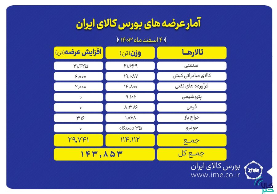 امروز همچنین ۲۵ هزار و ۹۰۲ تن مواد پلیمری، شیمیایی و قیر در تالار پتروشیمی و فرآوردههای نفتی روی تابلو میرود.