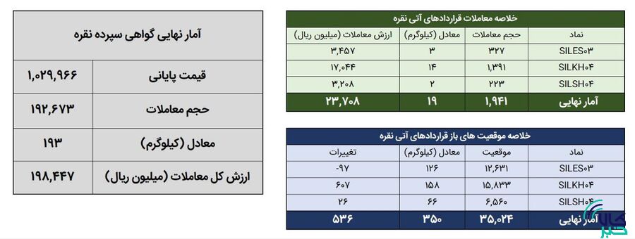 همچنین هزار و ۹۴۱ قرارداد معادل ۱۹ کیلوگرم شمش نقره به ارزش ۲ میلیارد تومان در بازار آتی منعقد شد. در پایان روز معاملاتی گذشته موقعیت های باز قراردادهای آتی نقره تقریبا معادل ۳۵۰ کیلوگرم شمش نقره بود.