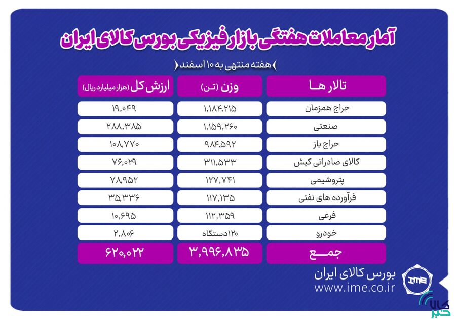 در این تالار یک میلیون و ۱۸۴ هزار و ۲۱۵ تن سیمان، یک میلیون و ۲۱۹ هزار تن سنگآهن، ۶۰۹ هزار و ۶۷۰ تن فولاد، ۱۵۶ هزار و ۳۰۰ تن آهن اسفنجی، ۷ هزار و ۳۶۰ تن مس، ۹ هزار و ۴۰ تن آلومینیوم، یک هزار و ۷۱۵ تن شمش روی و ۴۵۰ تن کنسانتره مولیبدن معامله شد.