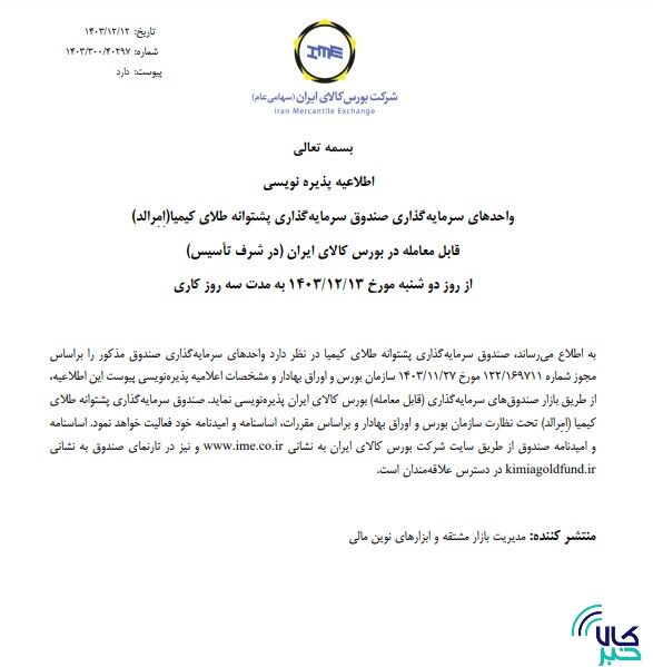 صندوق سرمایه گذاری پشتوانه طلای کیمیا در نظر دارد واحدهای سرمایه گذاری خود را براساس مجوز سازمان بورس و اوراق بهادار و مشخصات اعلامیه پذیره نویسی این اطلاعیه، از طریق بازار صندوق های سرمایه گذاری (قابل معامله) بورس کالای ایران پذیره نویسی کند.