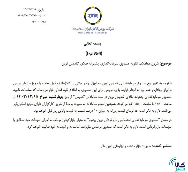 به گزارش کالاخبر،بر اساس این اطلاعیه با توجه به تغییر نوع صندوق سرمایه گذاری گلدیس نوین، به اورق بهادار مبتنی بر کالا(طلا) و قابل معامله با مجوز سازمان بورس و اوراق بهاداروعدم نیاز به انجام فرآیند پذیره نویسی برای این صندوق، معاملات ثانویه صندوق سرمایه گذاری پشتوانه طلای گلدیس نوین در نماد معاملاتی"گلدیس" از روز چهارشنبه ۱۵ اسفند ماه از ساعت ١١:٣٠ تا ساعت ۱۵ آغاز می شود.