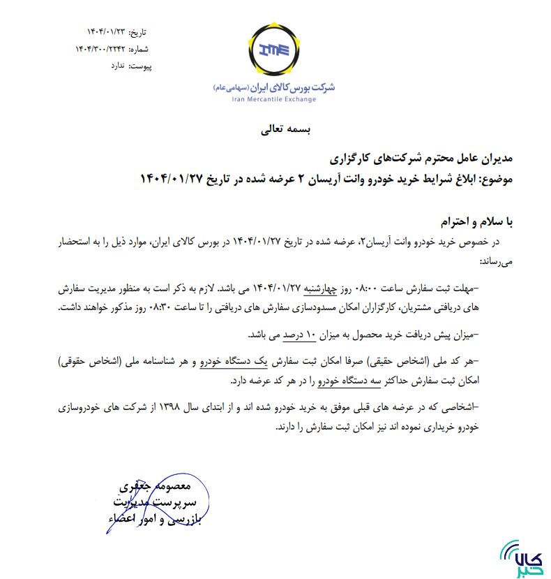به گزارش کالاخبر، مهلت ثبت سفارش ساعت ۸ روز شنبه ۲۷ فروردین ماه بوده و به منظور مدیریت سفارشهای دریافتی مشتریان، کارگزاران امکان مسدودسازی سفارشهای دریافتی را تا ساعت ۸:۳۰ روز مذکور خواهند داشت.