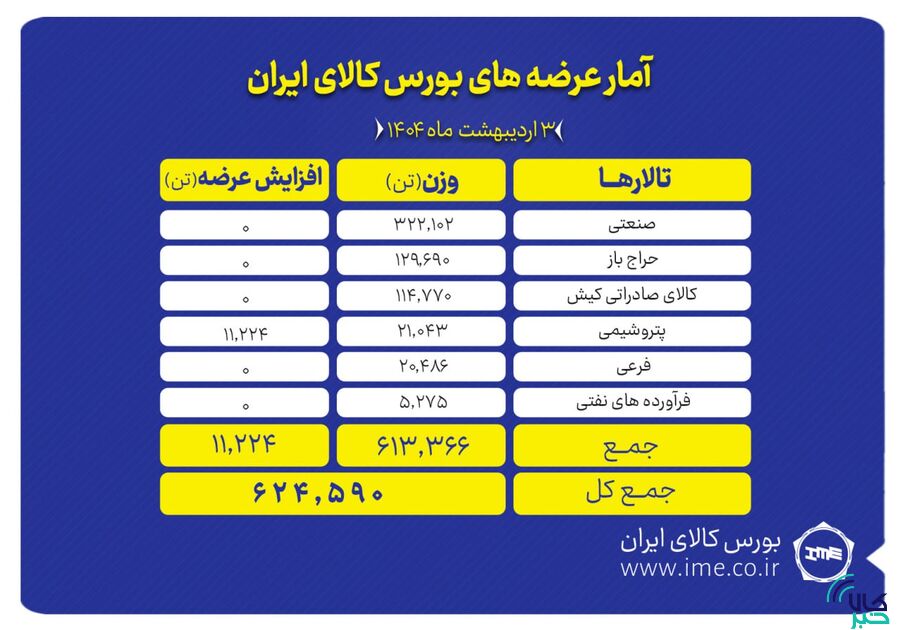 تالارهای بورس کالای ایران امروز ۳ اردیبهشت‌ماه میزبان عرضه ۶۲۴ هزار و ۵۹۰ تن انواع کالا و محصول است.