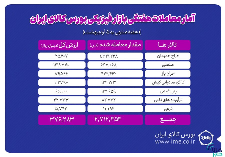همچنین ۱۹۸ هزارو ۴۳۱ تن محصول مواد پلیمری، شیمیایی، روغن، قیر و گوگرد در تالار فرآوردههای نفتی و پتروشیمی دادوستد شد.در این تالار ۱۱۳ هزار و ۶۵۹ تن مواد پلیمری، ۴۵ هزار تن لوب کات،۱۶ هزار تن گوگرد، ۱۵ هزار و ۱۷۲ تن قیر، ۵ هزار و ۹۰ تن روغن و ۳ هزار و ۵۱۰ تن فرآورده های نفتی به فروش رفت.