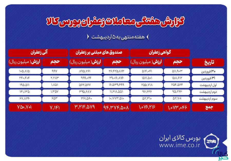 علاوه بر این، حجم معاملات صندوق های مبتنی بر زعفران نیز به ۹۴ میلیون و ۳۷۴ هزار و ۵۰۸ واحد به ارزش ۳۲۱ میلیارد تومان رسید.