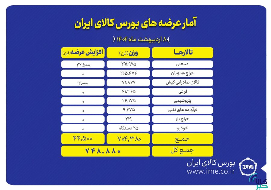 تالارهای بورس کالای ایران امروز دوشنبه ۸ اردیبهشت ماه میزبان عرضه ۷۴۸ هزار و ۸۸۰  تن انواع کالا و محصول است.