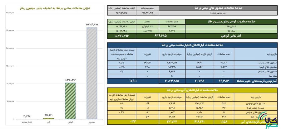 همچنین روز گذشته ۴۱۷ میلیون و ۸۷۱ هزار و ۶۰۲ واحد صندوق های مبتنی بر طلا به ارزش ۲.۵ همت دادوستد شد.