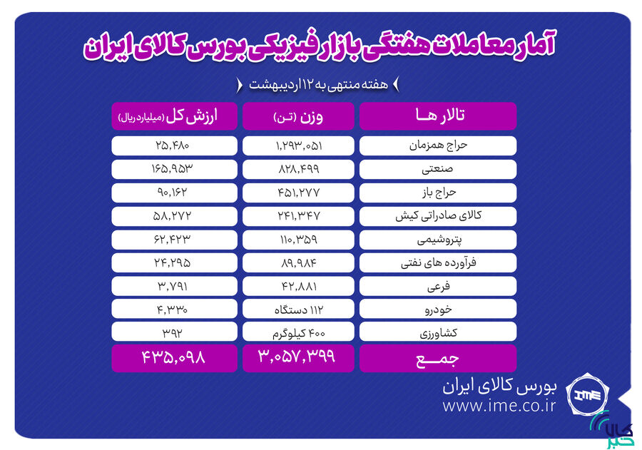 در این تالار یک میلیون و ۲۹۳ هزار و ۵۱ تن سیمان، ۷۱۲ هزار تن سنگآهن، ۲۰۴ هزار و ۰۷۹ تن فولاد، ۱۸۴ هزار تن آهن اسفنجی، ۱۸ هزار و ۹۵۰ تن آلومینیوم، ۵ هزار و ۸۴۵ تن مس، ۲ هزار و ۸۷۵ تن روی، ۲۵۰ تن چدن،۲۰۰ تن کنسانتره مولیبدن، ۶۰ تن مولیبدن و ۱۹ تن کنسانتره فلزات گران بها معامله شد.