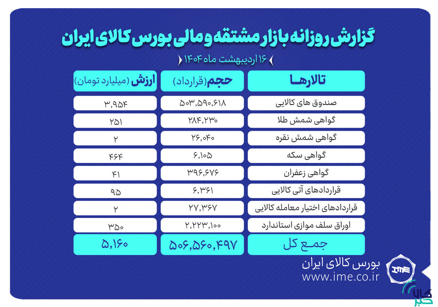روز گذشته در بازار مشتقه و مالی بورس کالای ایران در مجموع بیش از ۵۰۶ میلیون و ۵۶۰ هزار قرارداد به ارزش ۵ هزار و ۱۶۰میلیارد تومان منعقد شد.