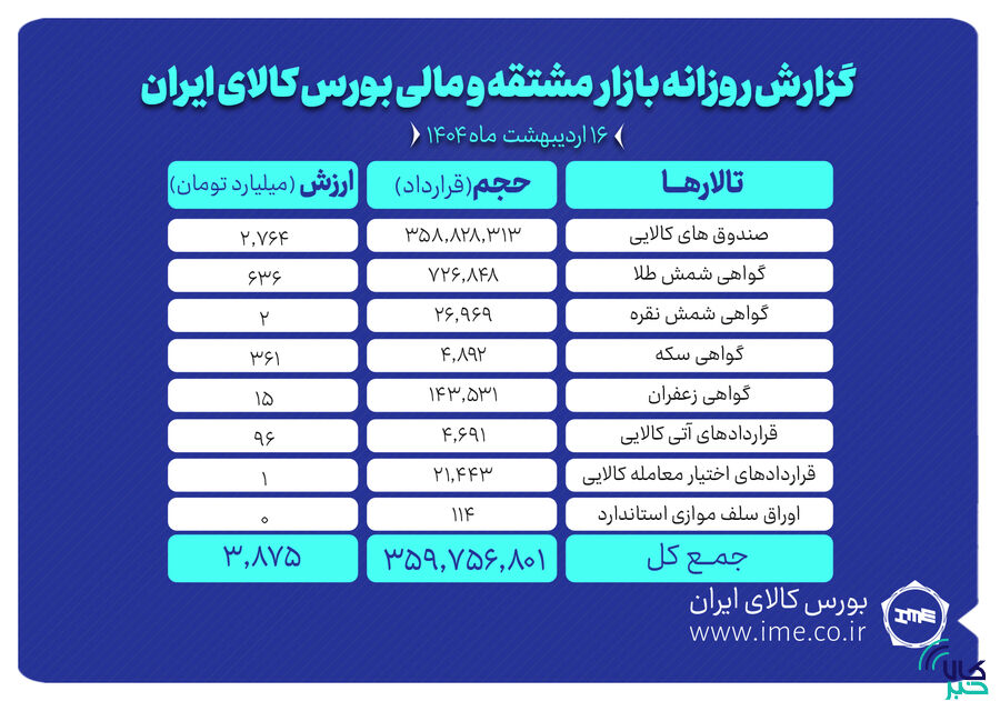 همچنین در معاملات روز گذشته بازار مشتقه و مالی، ۳۵۸ میلیون و ۸۲۸ هزار واحد صندوق کالایی به ارزش ۲ هزار و ۷۶۴ میلیارد تومان دست به دست شد.بیشترین حجم معاملات نیز به صندوق طلای عیار مفید(عیار) به میزان ۷۲میلیون واحد اختصاص یافت.