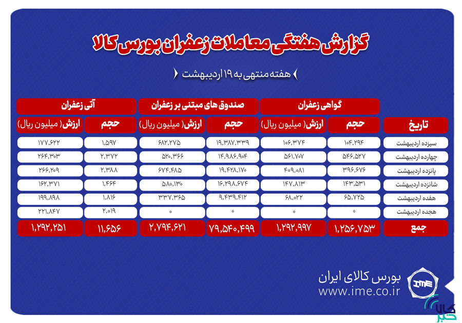 علاوه بر این، حجم معاملات صندوق های مبتنی بر زعفران نیز به ۷۹ میلیون و ۵۴۰ هزار واحد به ارزش ۲۷۹ میلیارد تومان رسید.