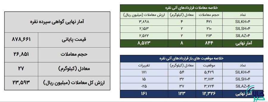 در روز ۲۲ اردیبهشت ماه در مجموع حدود ۳۵ کیلوگرم شمش نقره در بازار گواهی سپرده و قرارداد آتی مورد معامله قرار گرفت.