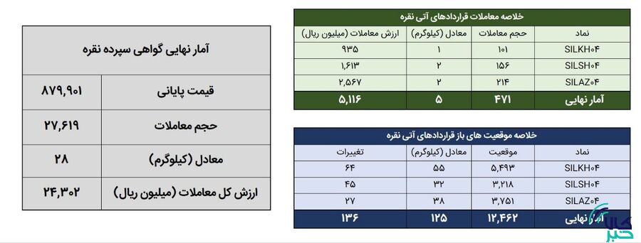 در روز ۲۳ اردیبهشت ماه در مجموع حدود ۳۲ کیلوگرم شمش نقره در بازار گواهی سپرده و قرارداد آتی مورد معامله قرار گرفت.