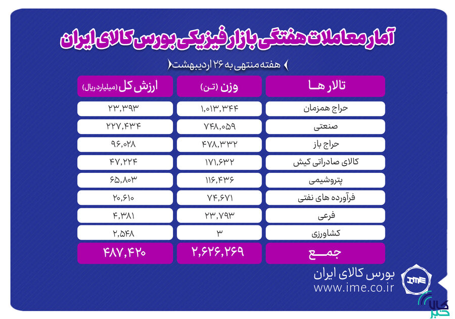 در این تالار یک میلیون و ۱۳ هزار و ۳۴۴ تن سیمان، ۴۱۷ هزار تن سنگآهن، ۵۸۳ هزار و ۶۹ تن فولاد، ۸۹ هزار و ۲۵۰ تن آهن اسفنجی، ۲۶ هزار و ۶۰۵ تن روی، ۶ هزار و ۹۷۵ تن آلومینیوم، ۶ هزار و ۶۰ تن مس، ۱۹۰ تن کنسانتره مولیبدن و ۲۹ تن کنسانتره فلزات گران بها معامله شد.