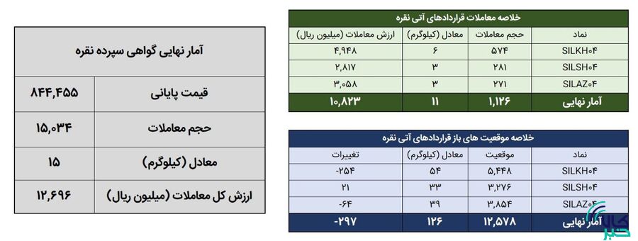 در روز ۲۸ اردیبهشت ماه در مجموع حدود ۲۶ کیلوگرم شمش نقره در بازار گواهی سپرده و قرارداد آتی مورد معامله قرار گرفت.