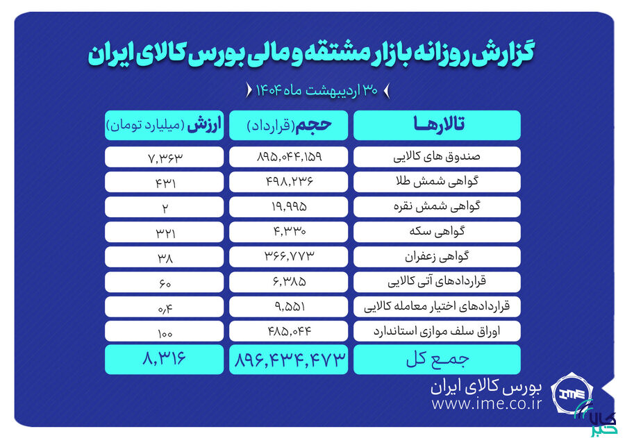 روز گذشته حجم و ارزش معاملات بازار مشتقه و مالی بورس کالای ایران رشد کرد و در مجموع ۸۹۶ میلیون و ۴۳۴ هزار قرارداد به ارزش ۸ هزار و ۳۱۶ میلیارد تومان منعقد شد.