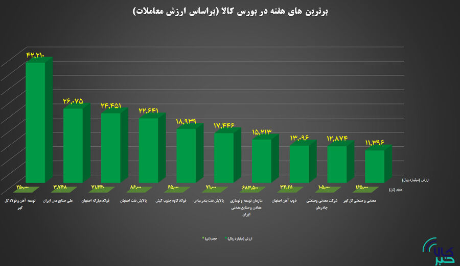 آمار معاملات بازار فیزیکی بورس کالای ایران نشان می دهد در هفته منتهی به ۳۱ اردیبهشت ماه بیش از ۳ میلیون و ۱۴۲ تن انواع کالا و محصول به ارزش بالغ بر ۴۲.۴ هزار میلیارد تومان معامله شد. همچنین ارزش معاملات ۱۰ شرکت برتر به بیش از ۲۰.۴ هزار میلیارد تومان رسید.
