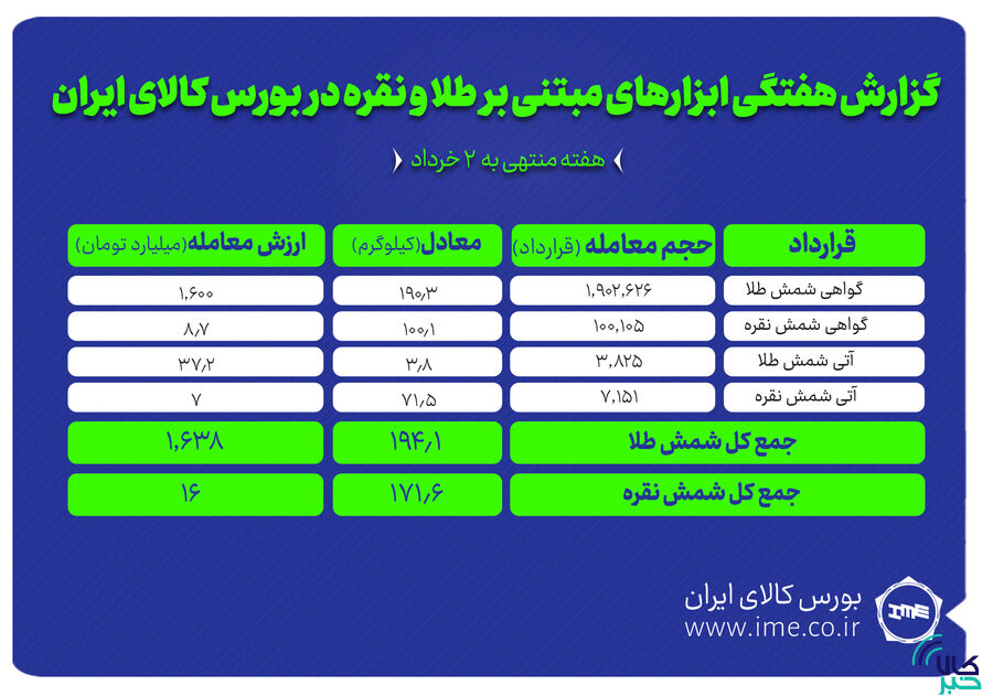 به این ترتیب در هفته گذشته در مجموع ۱۷۱.۶ کیلوگرم شمش نقره به ارزش حدود ۱۵.۷ میلیارد تومان و ۱۹۴.۱ کیلوگرم شمش طلا به ارزش ۱،۶۳۸ میلیارد تومان در بورس کالا منعقد شد.