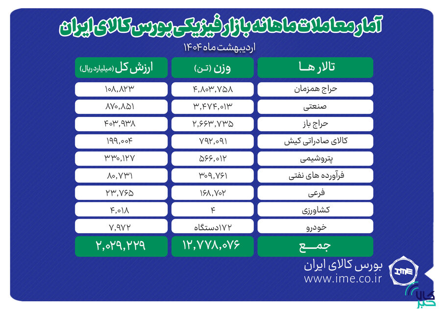 آمار معاملات بورس کالای ایران در دومین ماه از سال ۱۴۰۴ نشان می‌دهد که در این ماه ۱۲ میلیون و ۷۷۸ هزار و ۷۶ تن انواع کالا به ارزش ۲۰۲ هزار و ۹۲۳ میلیارد تومان در بازار فیزیکی دادوستد شد.