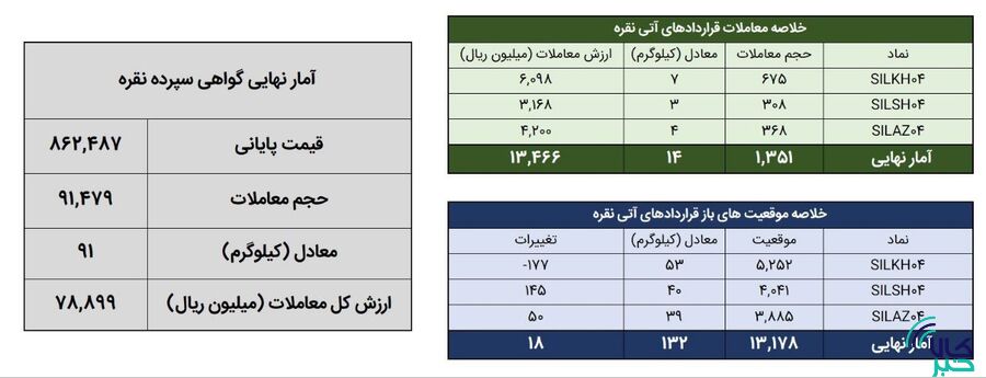 همچنین یک هزار و ۳۵۱ قرارداد آتی معادل ۱۴ کیلوگرم شمش نقره به ارزش ۱.۳ میلیارد تومان منعقد شد. در پایان روز معاملاتی گذشته موقعیت های باز قراردادهای آتی نقره معادل ۱۳۲ کیلوگرم شمش نقره بود.