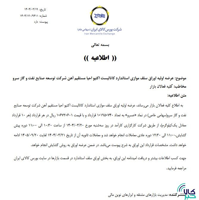 جزئیات انتشار اوراق سلف موازی استاندارد کاتالیست اکتیو احیا مستقیم آهن شرکت توسعه صنایع نفت و گاز سرو در لینک زیر قابل مشاهده است: