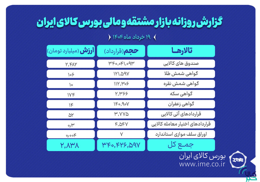 همچنین در معاملات روز گذشته بازار مشتقه و مالی، ۳۴۰ میلیون و ۴۱ هزار واحد صندوق کالایی به ارزش ۲ هزار و ۴۸۲ میلیارد تومان دست به دست شد. بیشترین ارزش معاملات نیز به صندوق طلای عیار مفید (عیار) اختصاص یافت.