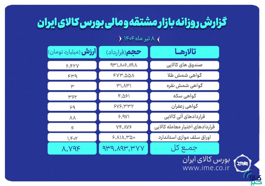 روز گذشته در بازار مشتقه و مالی بورس کالای ایران در مجموع بیش از ۹۳۹ میلیون و ۸۹۳ هزار قرارداد به ارزش ۸ هزار و ۷۹۴ میلیارد تومان منعقد شد.