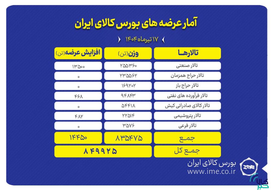 تالارهای بورس کالای ایران امروز سه‌شنبه ۱۷تیر ماه میزبان عرضه ۸۴۹ هزار و ۹۲۵ تن انواع محصول است. بیشترین عرضه امروز در تالار صنعتی رقم می خورد.