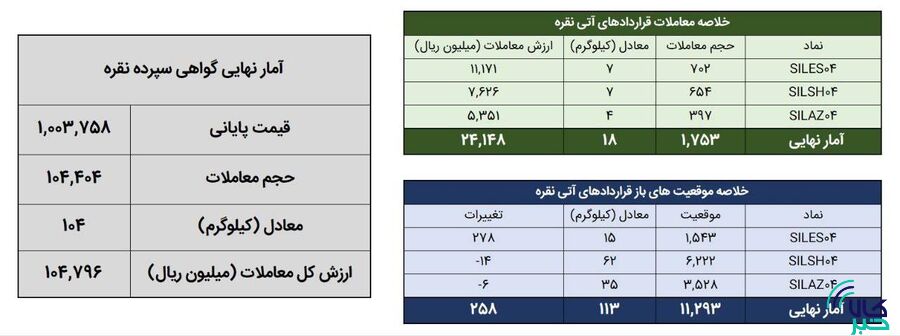 همچنین یک هزار و ۷۵۳ قرارداد آتی معادل ۱۸ کیلوگرم شمش نقره به ارزش ۲.۴ میلیارد تومان منعقد شد. در پایان روز معاملاتی گذشته موقعیت های باز قراردادهای آتی نقره معادل ۱۱۳ کیلوگرم شمش نقره بود. در قراردادهای آتی افزایش ۲۵۸ موقعیت در مجموع موقعیت های باز قراردادهای مبتنی بر نقره بودیم.